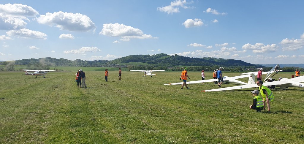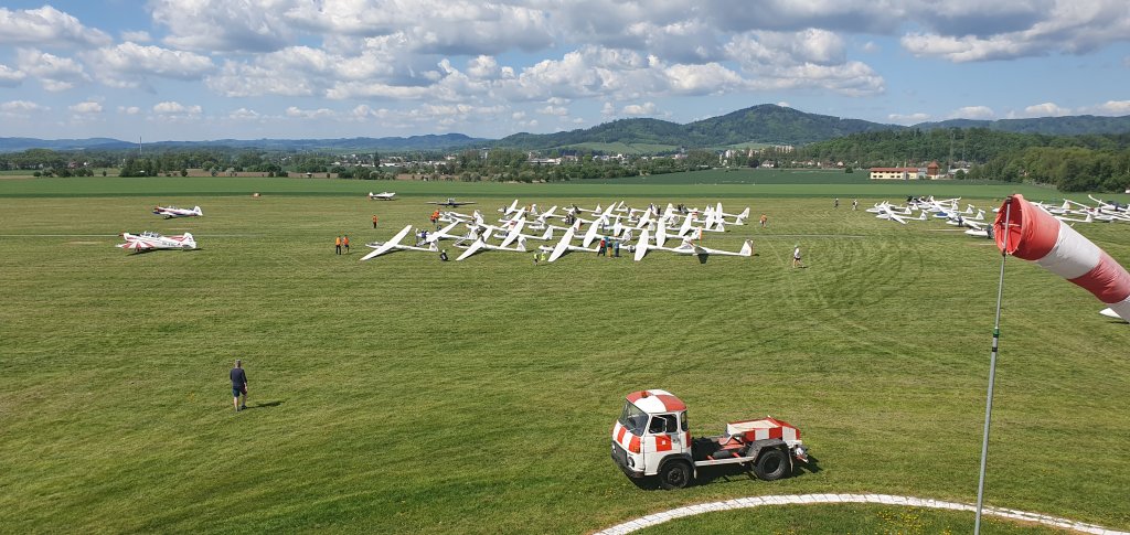 jedenácté hodiny, devět vlečných letadel začalo postupně tahat soutěžní větroně do vzduchu. Nejdříve startuje třída club. Po startu posledního, mají stanovený čas na zahájení soutěžního letu na 11.49.